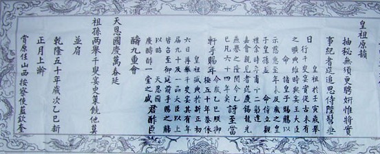 乾隆五十年(1785),四海承平,天下富足。適逢清朝慶典,乾隆帝為表示其皇恩浩蕩,在乾清宮舉行了千叟宴。宴會場面之大,實為空前。被邀請的老人約有三千名,這些人中有皇親國戚,有前朝老臣,也有的是從民間奉詔進京的老人。在座老人中有不少是飽學鴻儒,當眾吟詩聯句,即席用柏梁體選百聯句被史官記錄入史。乾隆皇帝還親自為90歲以上的壽星一一斟酒。當時推為上座的是一位最長壽的老人,據說已有141歲。當時乾隆和紀曉嵐還為這位老人做了一個對子,“花甲重開,外加三七歲月;古稀雙慶,內多一個春秋。”根據上聯的意思,兩個甲子年120歲再加三七二十一,正好141歲。下聯是古稀雙慶,兩個七十,再加一,正好141歲。堪稱絕對。